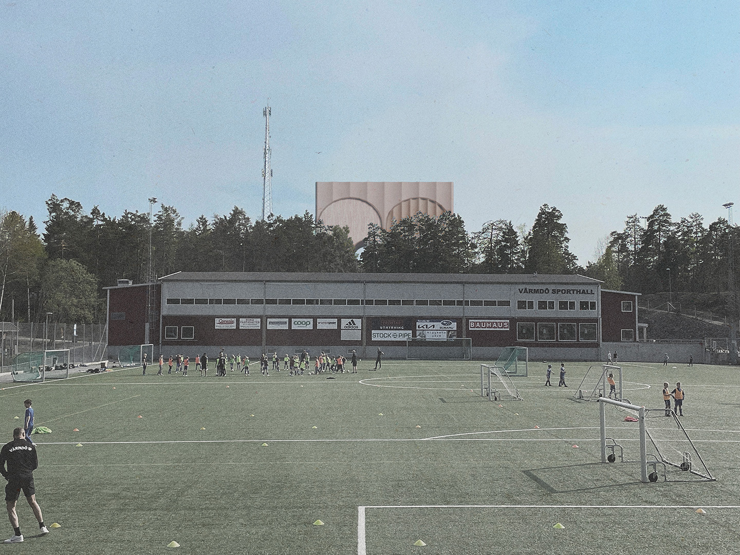 Byggnaden utförs i rödpigmenterad betong som ger ett mjukt intryck och harmonierar med berget och naturen under årstidernas skiftningar. Den röda kulören återfinns i närområdets skärgårdsmiljöer och många befintliga byggnader, från skolan i Hemmesta till industribyggnaderna på Gustavsbergs porslinsfabrik.