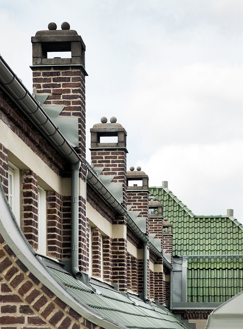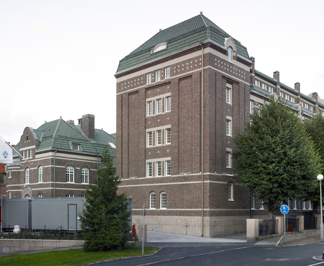 Taktegel, dörrar samt fönster har bytts ut, allt genom noggranna studier och urvalsprocess. Tegelfasaderna har renoverats, trasigt tegel har ersatts och fogarnas yttre del har frästs ur och ersatts med ny. Tegelfasadens renovering gjorde att den vackra grönskan, som vuxit på den administrativa byggnaden under lång tid, var tvungen att tas bort.